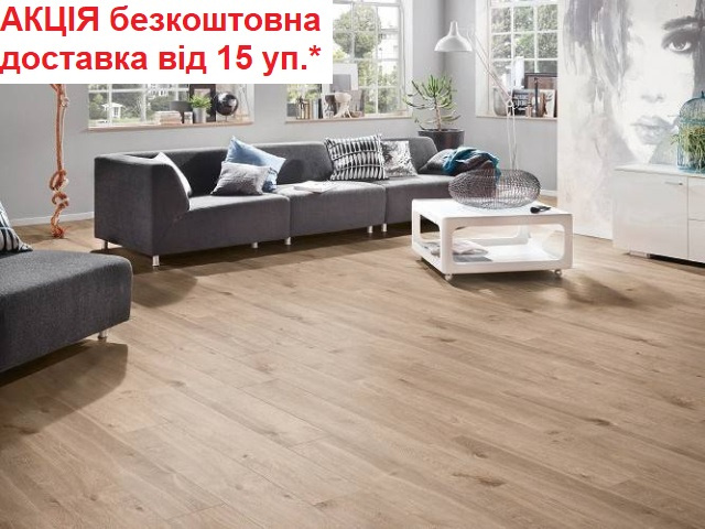 Ламінат KronoOriginal Дуб Еурус К406 з колекції Castello Classic – це втілення класичного стилю та практичності. Бежевий відтінок дуба та односмуговий дизайн під дерево створюють відчуття легкості та простору. Відсутність фаски забезпечує ефект суцільного, монолітного покриття.