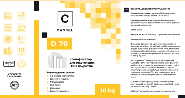 Клей фіксатор Stauf Cassel IBOLA D70 – універсальний дисперсійний клей для укладання підлогових покриттів. Цей клей підходить для різних типів покриттів, включаючи лінолеум, кварц-вінілову плитку, спортивні покриття з полівінілхлориду та дизайнерські покриття з ПВХ (LVT). Cassel D70 володіє відмінною стійкістю до старіння і не містить розчинників, що робить його безпечним для використання в приміщеннях з підлогами, що підігріваються.